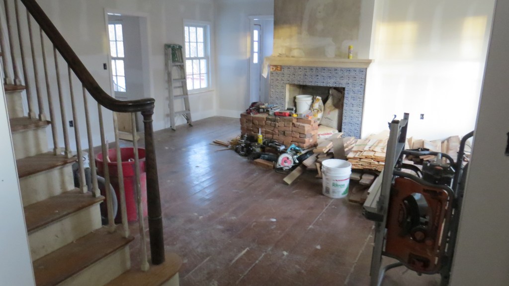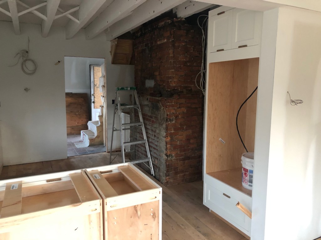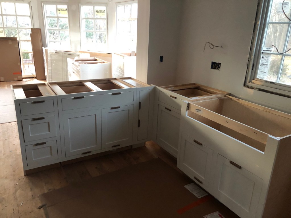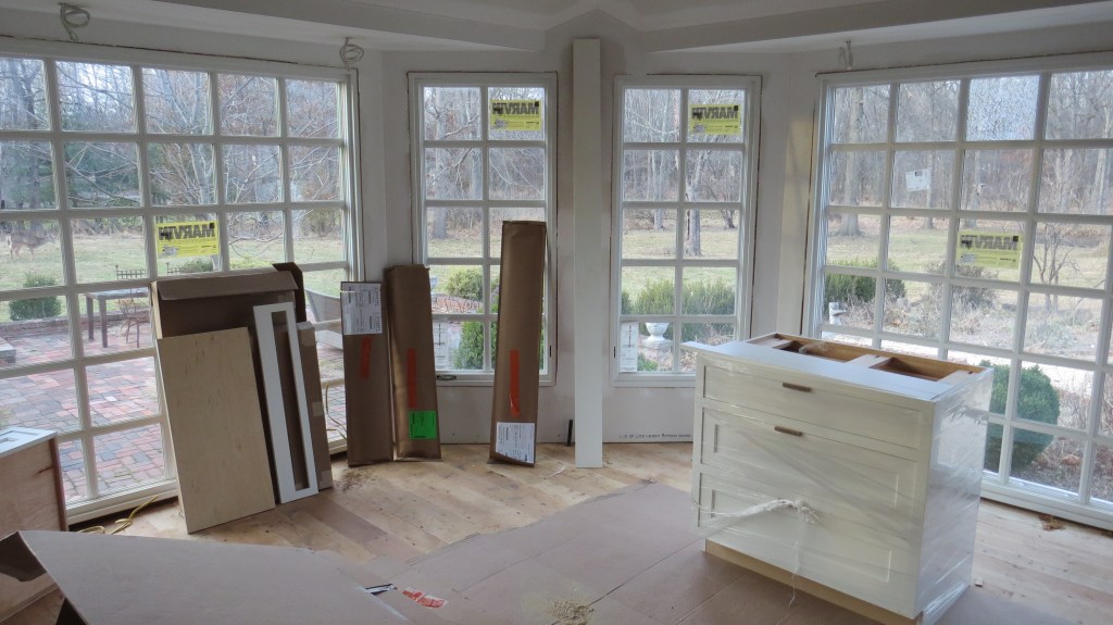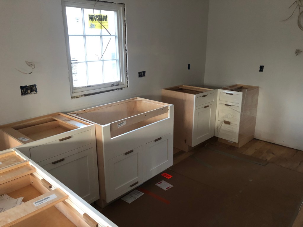 Cabinets and hardwood and walls, oh my! Lots of things going on all at once. The heat will be back on soon and we’ll be rushing to the finish…
